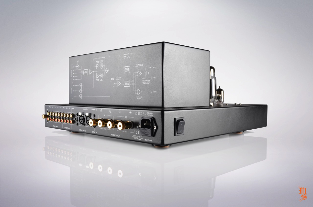 The balanced power amp is based on KT120 (optionally KT150) beam tetrodes and our latest, fully symmetrical output transformer design. Due to the symmetrical circuitry, we were able to further reduce the output noise of the output stage. In addition, our new BIAS section on the front panel makes it really easy to check and fine-tune the bias levels of the output tubes.