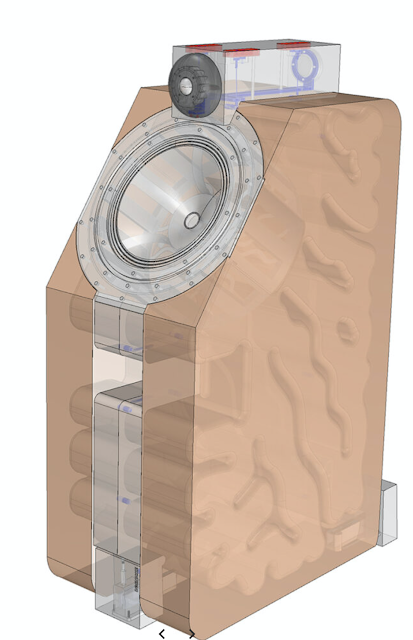 Drivers are custom made Supravox 28.5 cm with paper voice coil former, bronze phase plug and an Audax dome tweeter in a bronze half sphere.