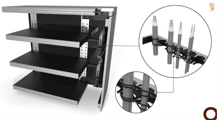 The CS-II cable laying system achieves a clear improvement in sound quality by using NBR O-rings for free-floating mounting of the cables. This converts vibration energy into heat. The cables with a diameter range of 6 to 20 millimeters are also mechanically decoupled. In addition, CS-II makes use of a further decoupling system between the suspension and the hi-fi rack.