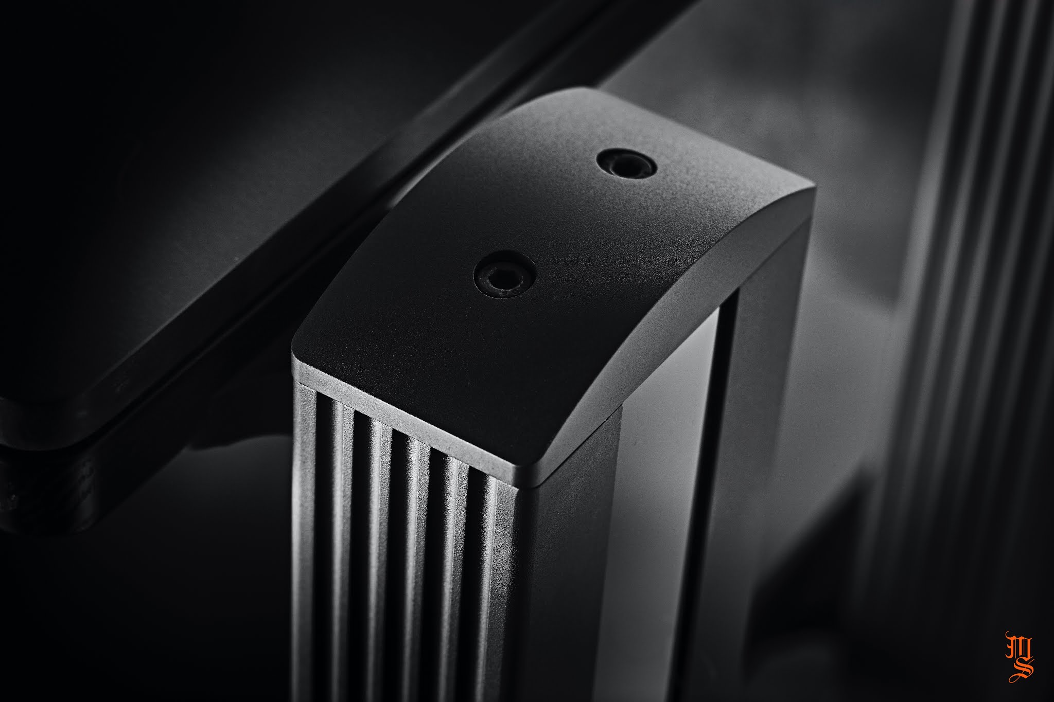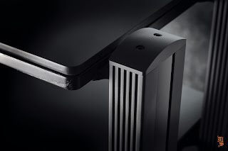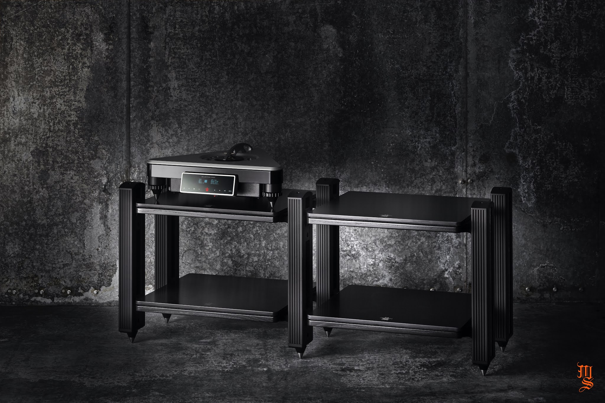 Each shelf is a triple, constrained layer damped sandwich consist- ing of a top plate of Kerrock® and a bottom layer of compressed high-density MDF, joined by a thin, non-resonant layer of sticky, black, highly viscous bitumen for optimal resonance control and mechanical damping. Kerrock® is a non-porous, homogeneous material, composed of one-third acrylic resin (also known as polymethyl methacrylate or PMMA), and two-thirds natural minerals.