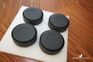 Our friends from Alchemy of Sound have received the first preview set of the all-new Kuzma Damper footers. They are made of painted aluminium (similar to the latest Kuzma Stabi R turntable) with blue elastomer inserts that act as shock absorbers and pressure balancers.
