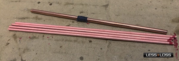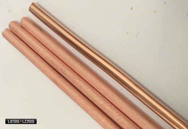 In slightly different lighting, this image shows in direct comparison how different our in-house made raw material is from standard copper. Standard copper, even soft annealed type, withstands considerable pressure. Our special material does not at all and must be handled with the most extreme care.