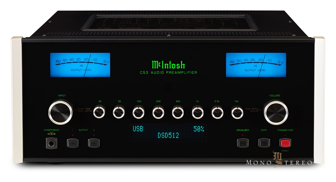 All this audio technology is packaged inside the C53’s classic McIntosh design featuring a black glass front panel backlit by direct LED lighting, blue meters, rotary knobs, an illuminated logo and aluminum end caps. An attractive polished stainless steel chassis finishes the distinguished look. It can be paired with an assortment of amplifiers, CD players, turntables, tuners, media streamers, room correction devices and speakers to complete a home audio system.