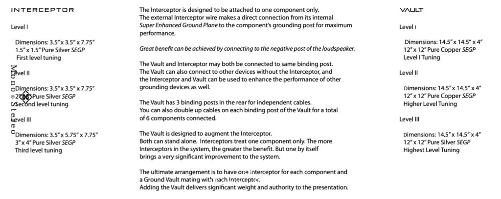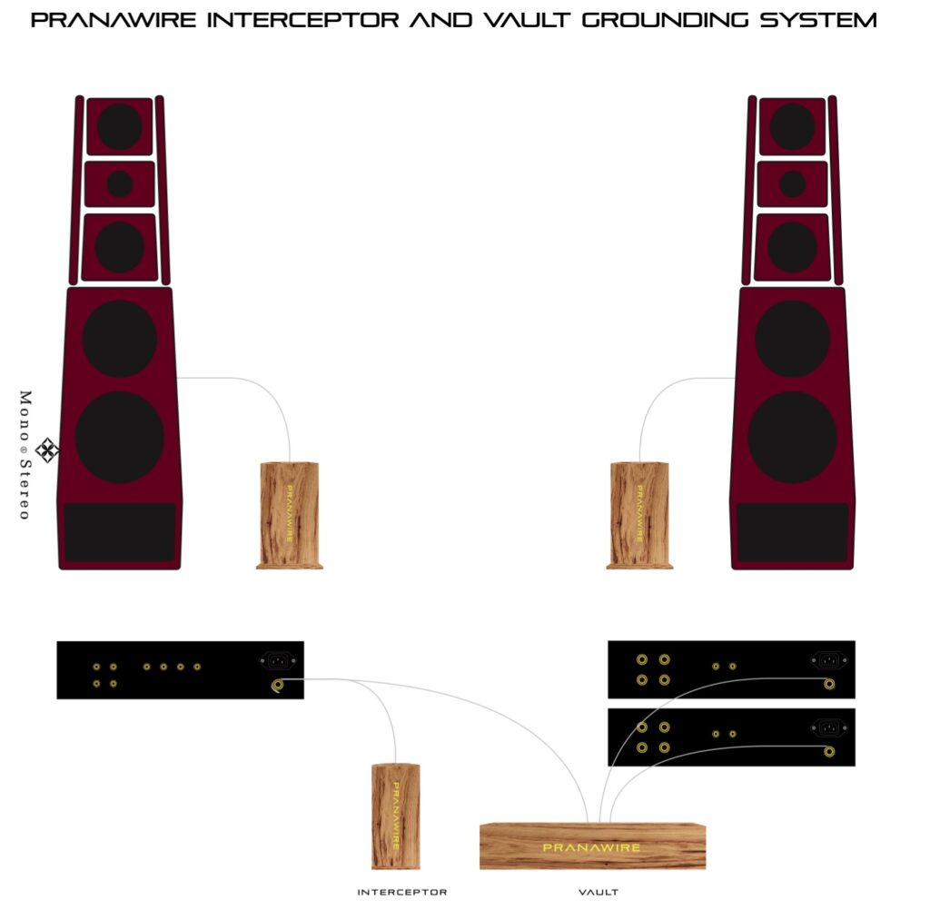 Various products have demonstrated sonic improvements via outboard extensions of the internal grounding in components. PranaWire has taken an entirely new, uncompromising approach with the development of its sophisticated multi-layered Super Enhanced Ground Plane employed in the new Interceptor and Vault series ground treatment devices. The construction of the various pure silver and pure copper SEGPs we have designed is meticulous and complex, using expensive treatments, materials and parts to absorb vibrations and noise. The SEGP is surrounded by a massive amount of powerful noise absorbing materials inside of a copper lined chassis.