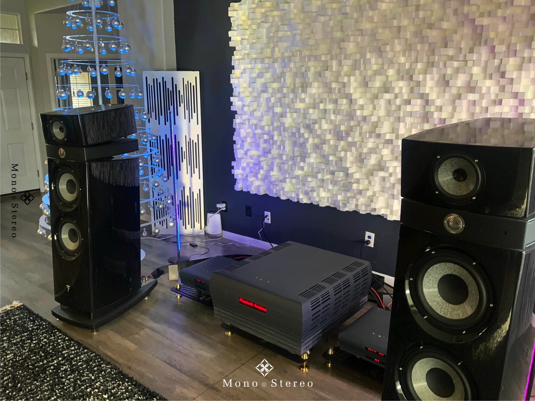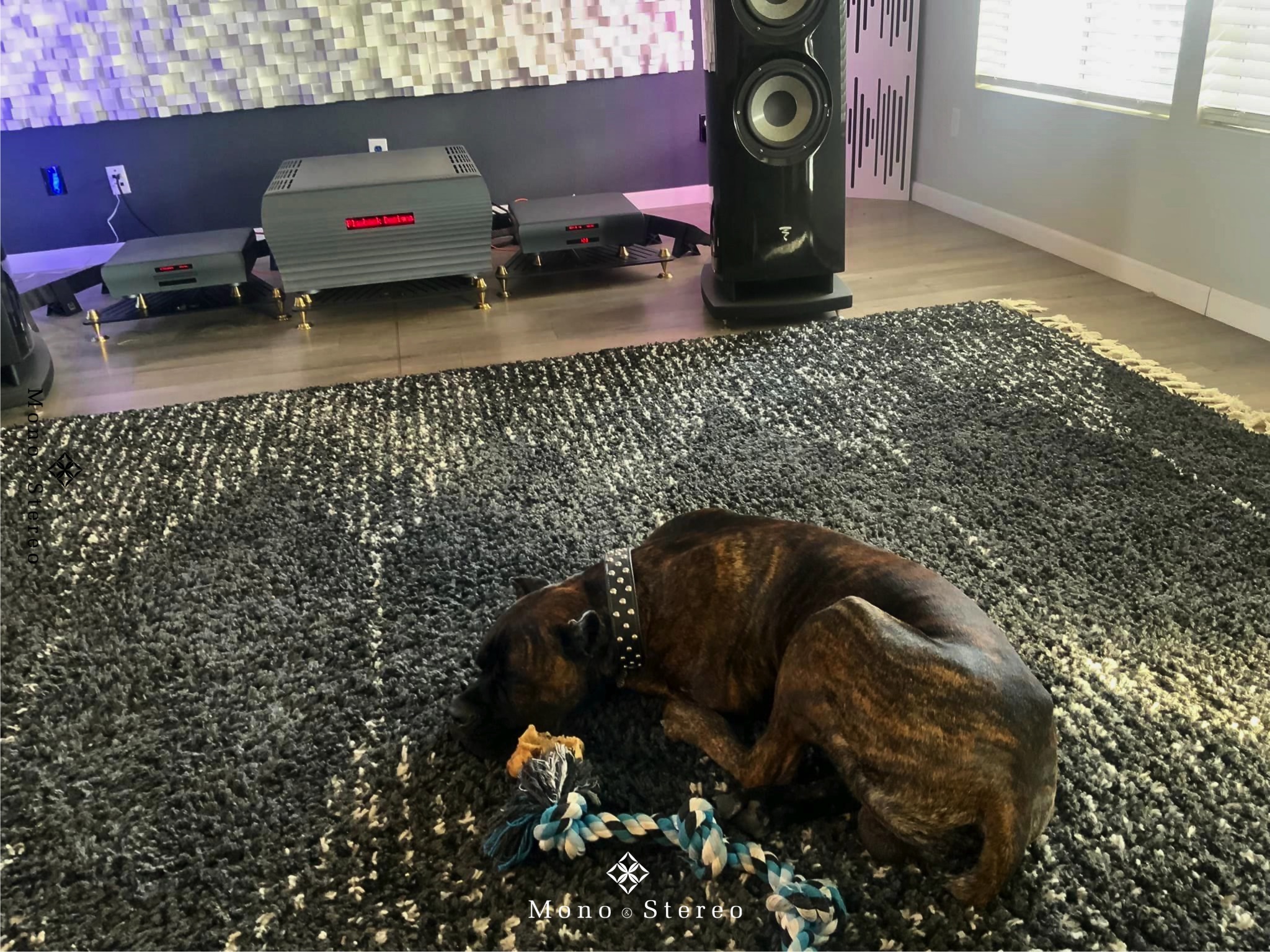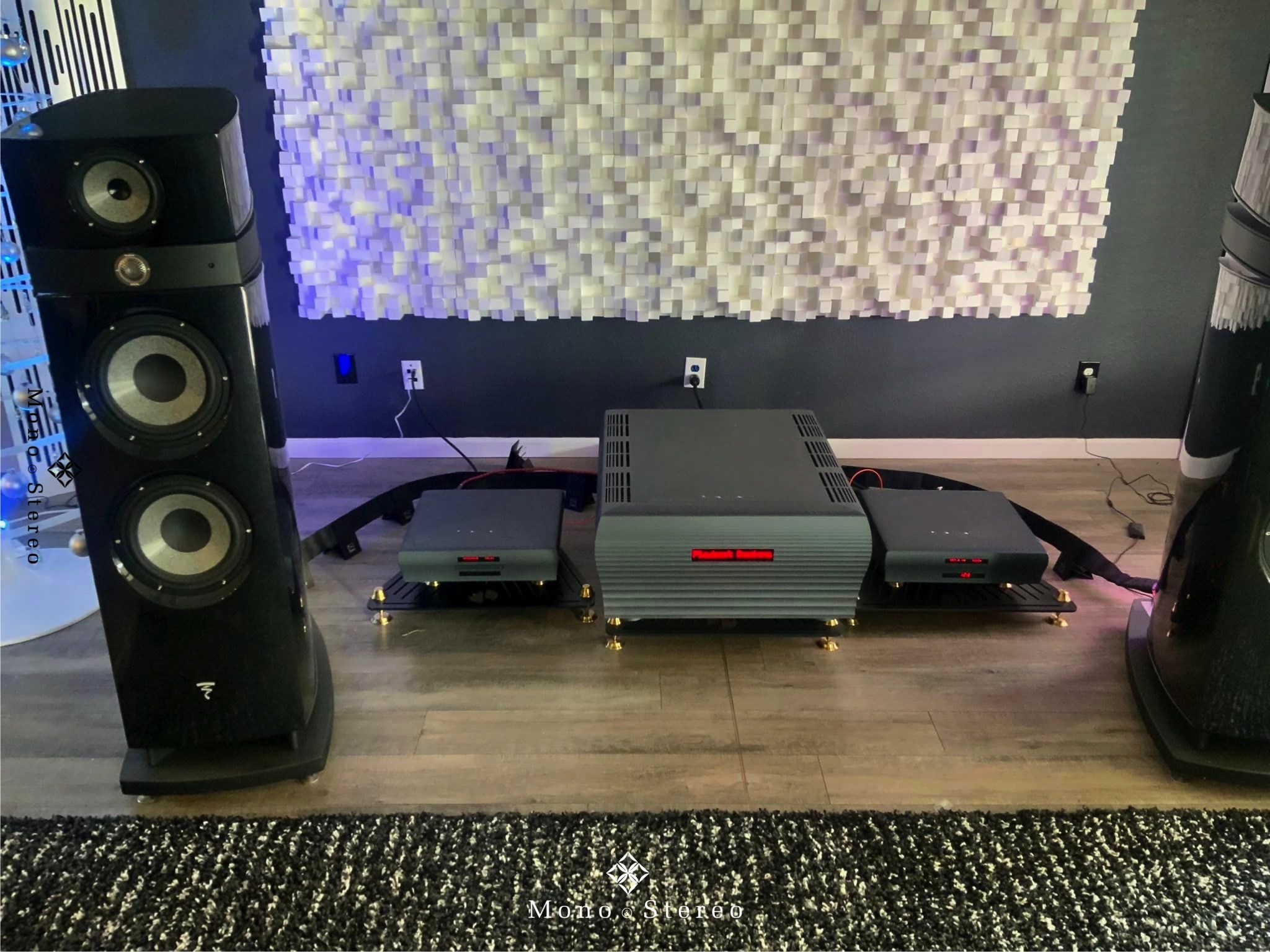 An impressive high-end audio system with Focal Maestro Utopia Evo loudspeakers, Playback Designs MPD-8 DAC, MPT-8 server/transport, SPA-8 amplifier, and Live Vibe amplifier stands. Owned by Dave Olson and supervised by Mortimer Cane Corso.