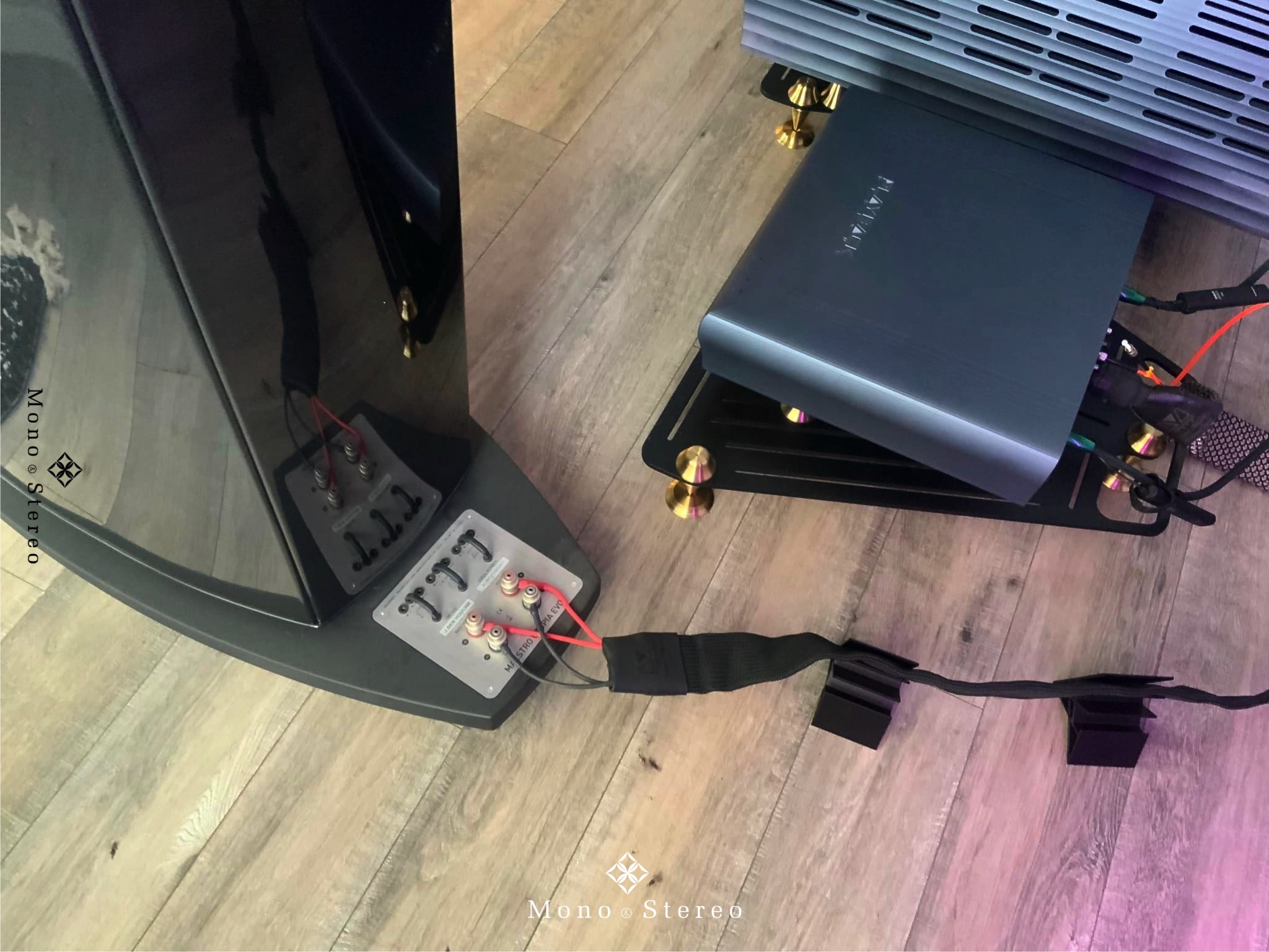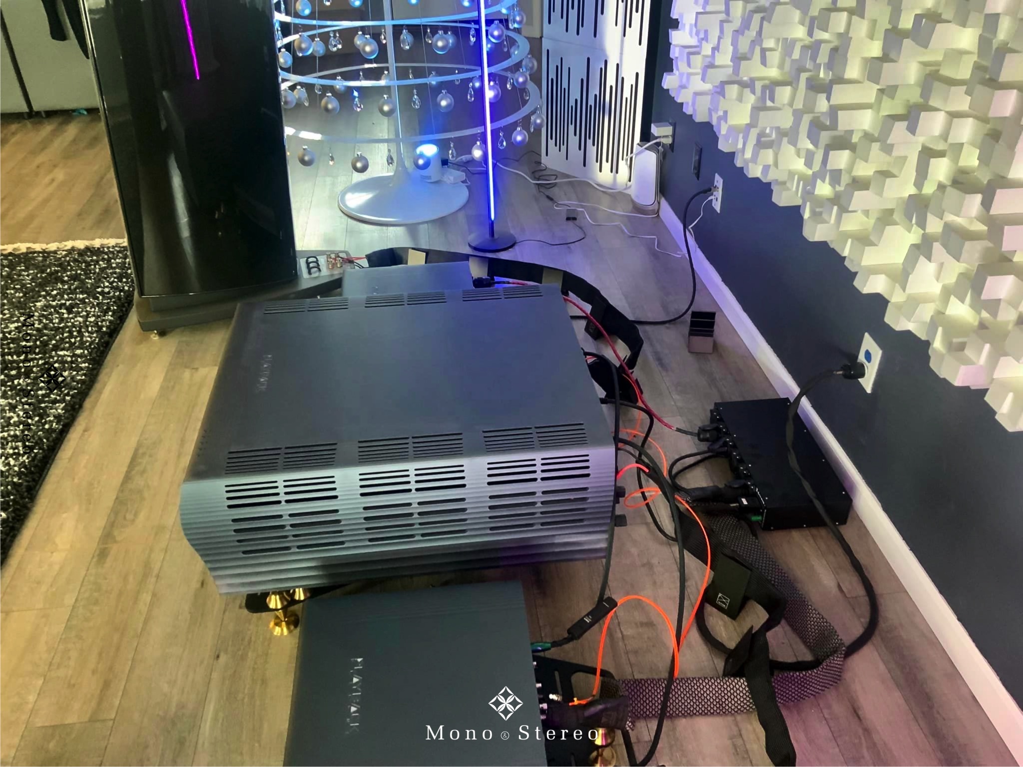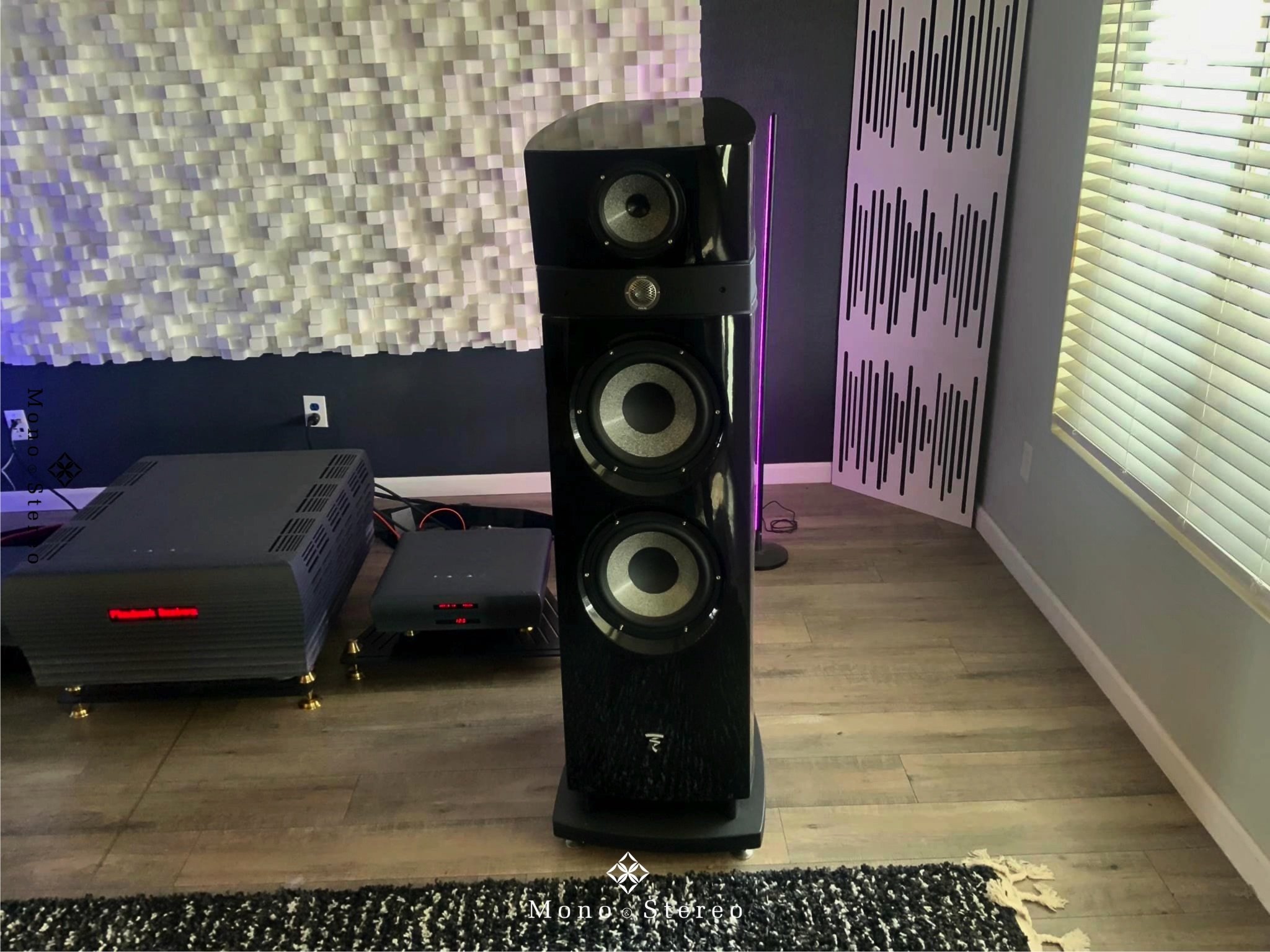 An impressive high-end audio system with Focal Maestro Utopia Evo loudspeakers, Playback Designs MPD-8 DAC, MPT-8 server/transport, SPA-8 amplifier, and Live Vibe amplifier stands. Owned by Dave Olson and supervised by Mortimer Cane Corso.