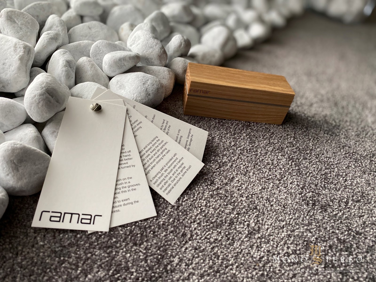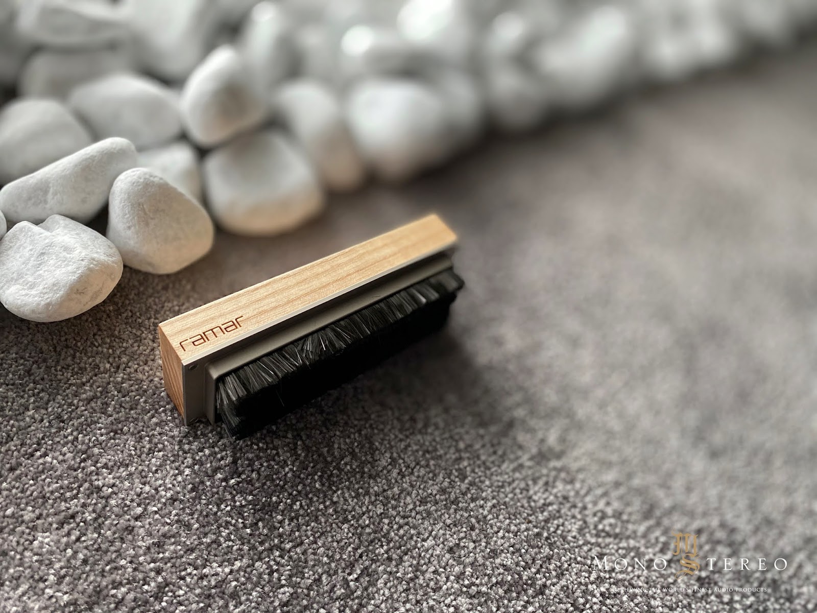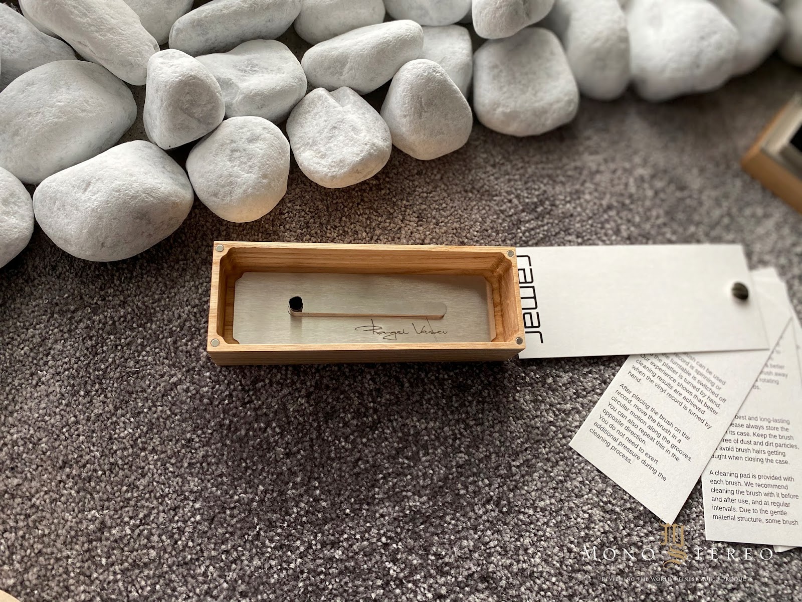 Beautiful ramar hand made record brush just arrived from Germany. Of course, I couldn’t keep my enthusiasm bottled and wanted to see and get a feeling this German high-end audio analog accessory as soon as possible. This beautifully carved brush screamed quality with each new unfolding of the package. From bi-color card box packaging, clever and stylish paper leaflet, to the selection of materials. In the wooden box, under the main brush, there is the additional, smaller cartridge’s needle brush that is magnetically locked to the metal bottom surface. Neat!