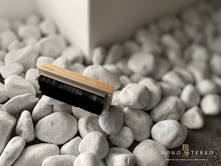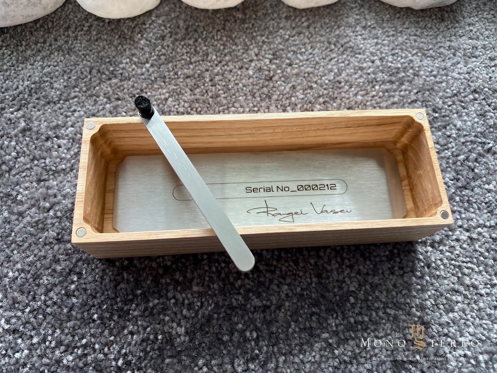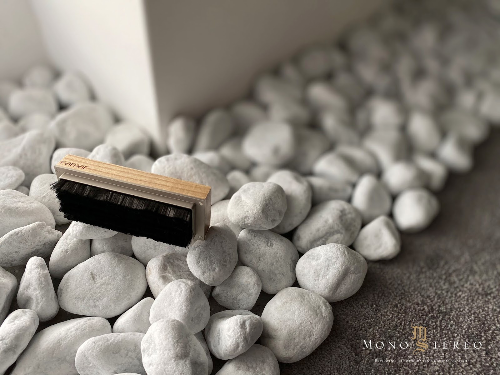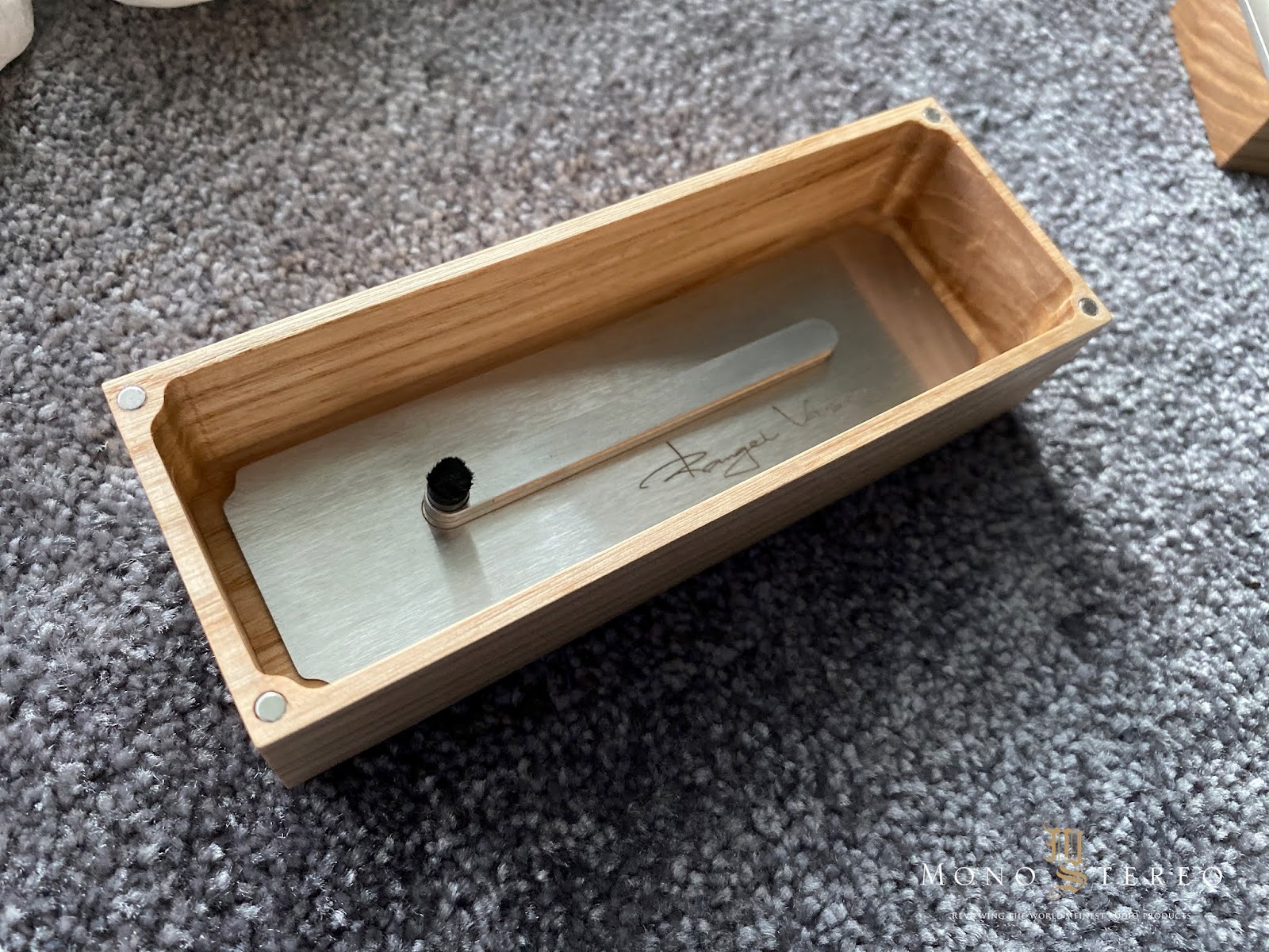 Beautiful ramar hand made record brush just arrived from Germany. Of course, I couldn’t keep my enthusiasm bottled and wanted to see and get a feeling this German high-end audio analog accessory as soon as possible. This beautifully carved brush screamed quality with each new unfolding of the package. From bi-color card box packaging, clever and stylish paper leaflet, to the selection of materials. In the wooden box, under the main brush, there is the additional, smaller cartridge’s needle brush that is magnetically locked to the metal bottom surface. Neat!