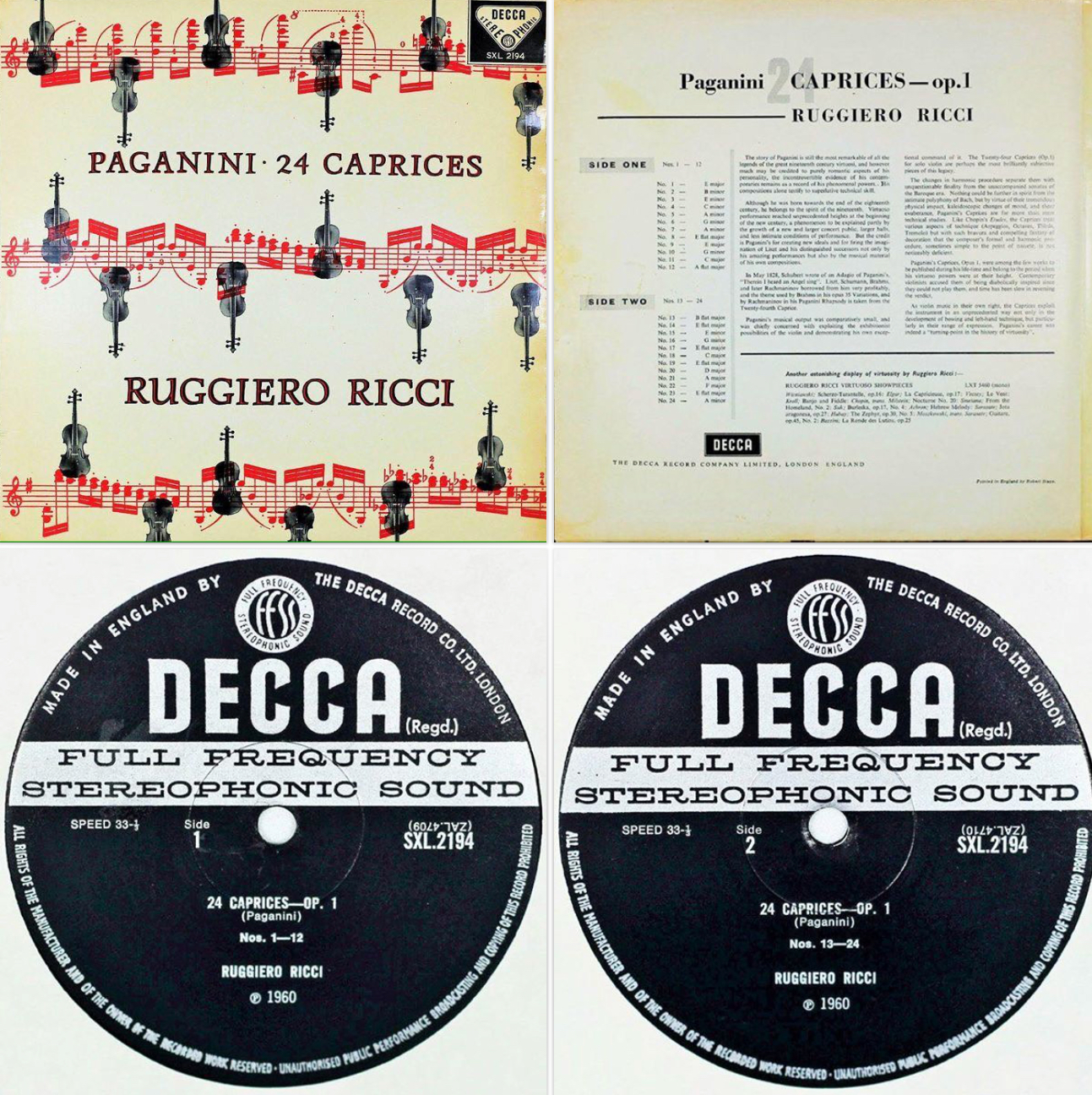 In 1947, Ricci was the first violinist to record the complete Paganini’s 24 Caprices, Op. 1, in their original form. Ricci’s first recording was on the Shellac 78rpm recording, but he later made three other recordings of the Caprices, including his last that he played, on September 18, 1997, (his fourth recording) on the Paganini’s own Cremonese 1743 Bartolomeu Giuseppe Guarneri del Gèsu, Il Cannone violin, on loan to him by the City of Genoa, Italy.