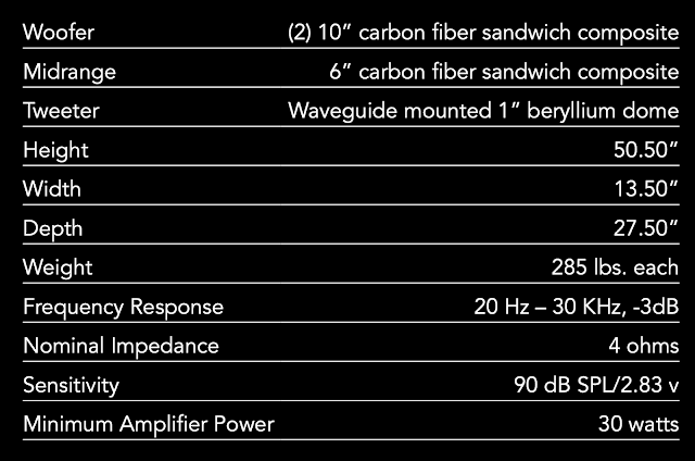 Genuine, first octave extension is delivered via two, all new, custom designed and built 10 inch carbon fiber/sandwich composite woofers per channel. The woofer’s massive 3 inch diameter motor system provides enormous thermal and mechanical headroom and also exhibits the same vanishingly low distortion figures as our midrange driver (-60 dB!).