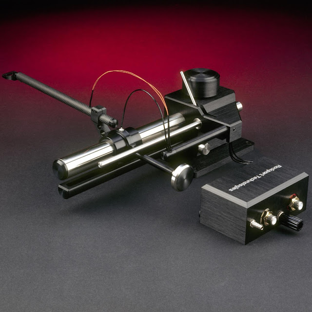 Next up in the history of Rockport Technologies products is the Series 6000 Tonearm: essentially a mirror imaged version of the tonearm found on the original Capella Phonograph (also debuting in 1994), which made it possible to mount it on other manufacturer’s phonographs. Like all Rockport Technologies tonearms, it featured an ultra-high precision (sub-micron machining tolerances) critically damped groove compensated air bearing. In contrast to other air bearing tonearms of its day, it utilized high-pressure in conjunction with a patented flow characteristic that resulted in a bearing with extremely high central stiffness, low-flow, and intrinsically stable behavior, as well as zero friction. The tonearm tube was a constrained layer damped carbon fiber sandwich composite, and all aspects of the tonearm’s geometry were fully adjustable.