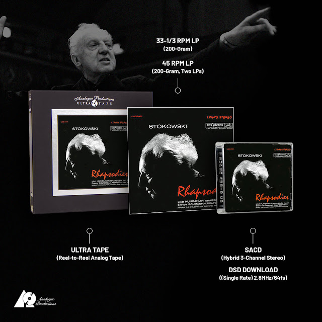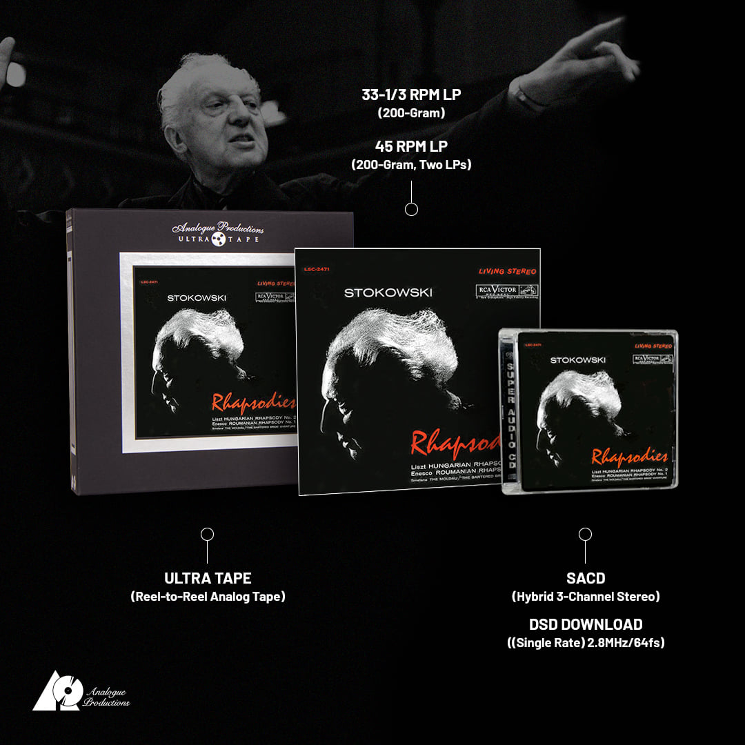 “Maestro Stokowski is at the podium and Bob Simpson is at the 3-track Ampex recorder to capture the Rhapsodies from Liszt, Enesco and Smetana that give this issue its title. This is titanic sound that will sink most speakers and amps for that matter. A must. The original 3-track session tapes were used in mastering for LPs and SACDS.”