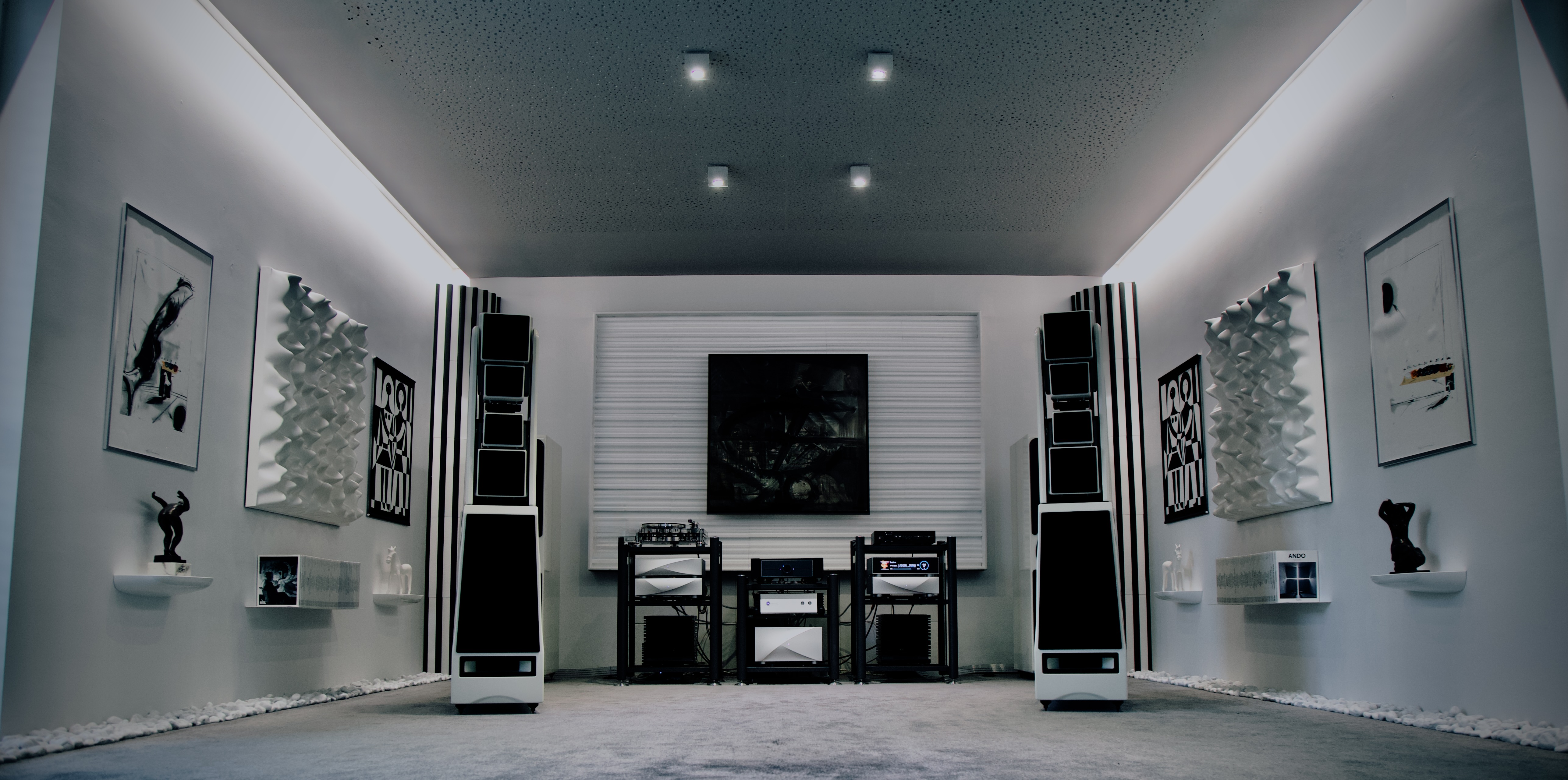 An exclusive, bespoke, purpose-built atelier-level listening sanctum, front to back artfully and acoustically designed from the foundation with uncompromising attention to detail for an unparalleled audio experience. The room’s dimensions are based on the golden ratio and the fibonacci sequence, ensuring perfectly balanced proportions and aural harmony. Every aspect of the room’s acoustics is comprehensively calculated, calibrated, and rigorously controlled. Exact left–right mirroring provides perfect acoustic symmetry, while passive and active systems control key parameters such as RT60 decay time, room modes, and low-frequency behavior.