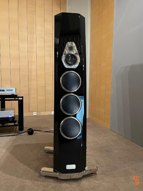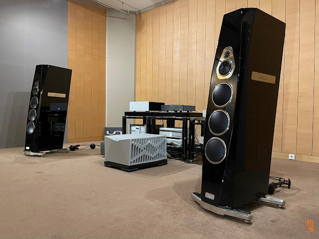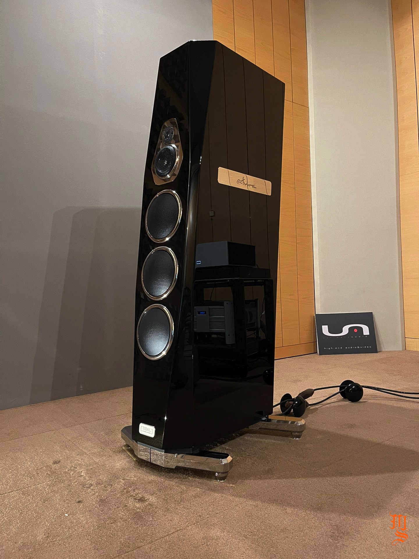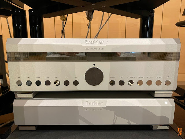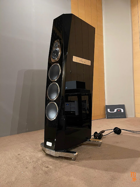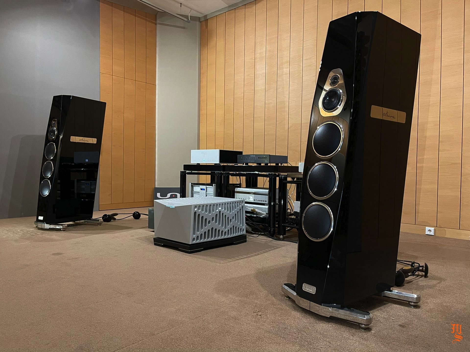 Upper echelon high-end audio system with Tidal Audio Akira speakers partnered with Boulder, Taiko Audio SGM Extreme server, Aqua Acoustic Quality DAC, etc. At Ultimate Audio Elite.