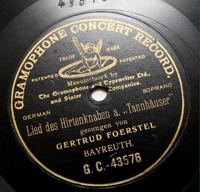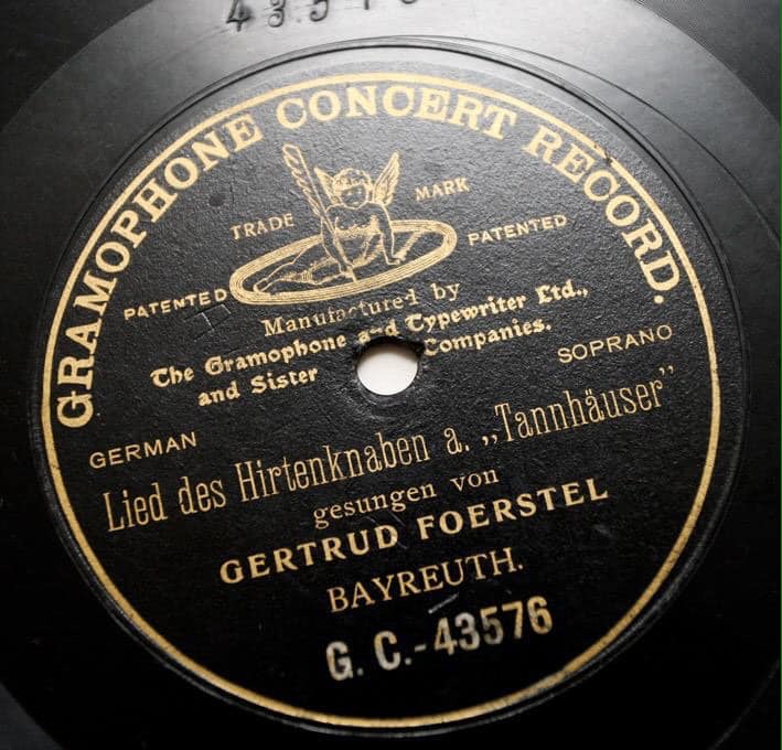 Very rare Tannhauser, Frau Holda kam aus dem Berg (Lied des Hirtenknaben) for unaccompanied soprano, Gertrud Foerstel, soprano, with english horn solo before and after the singing. Gramophone and typewriter Ltd., Gramophone Concert Record, G. C.-43576, Black & gold original label, single, one sided, 10″ record, 78 rpm, matrix 1121e, Angel embossed on back, recorded in Bayreuth in 1904, Made in Germany (Reproduced in Hanover) – Saulo Zucchello.