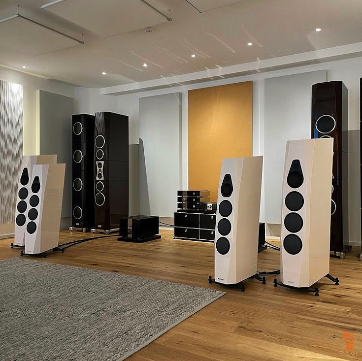 Vimberg Audio Mino and Tonda speakers at Tidal/Vimberg headquarters. A clear DNA synergy emanating from the bigger Tidal Audio siblings in the background.