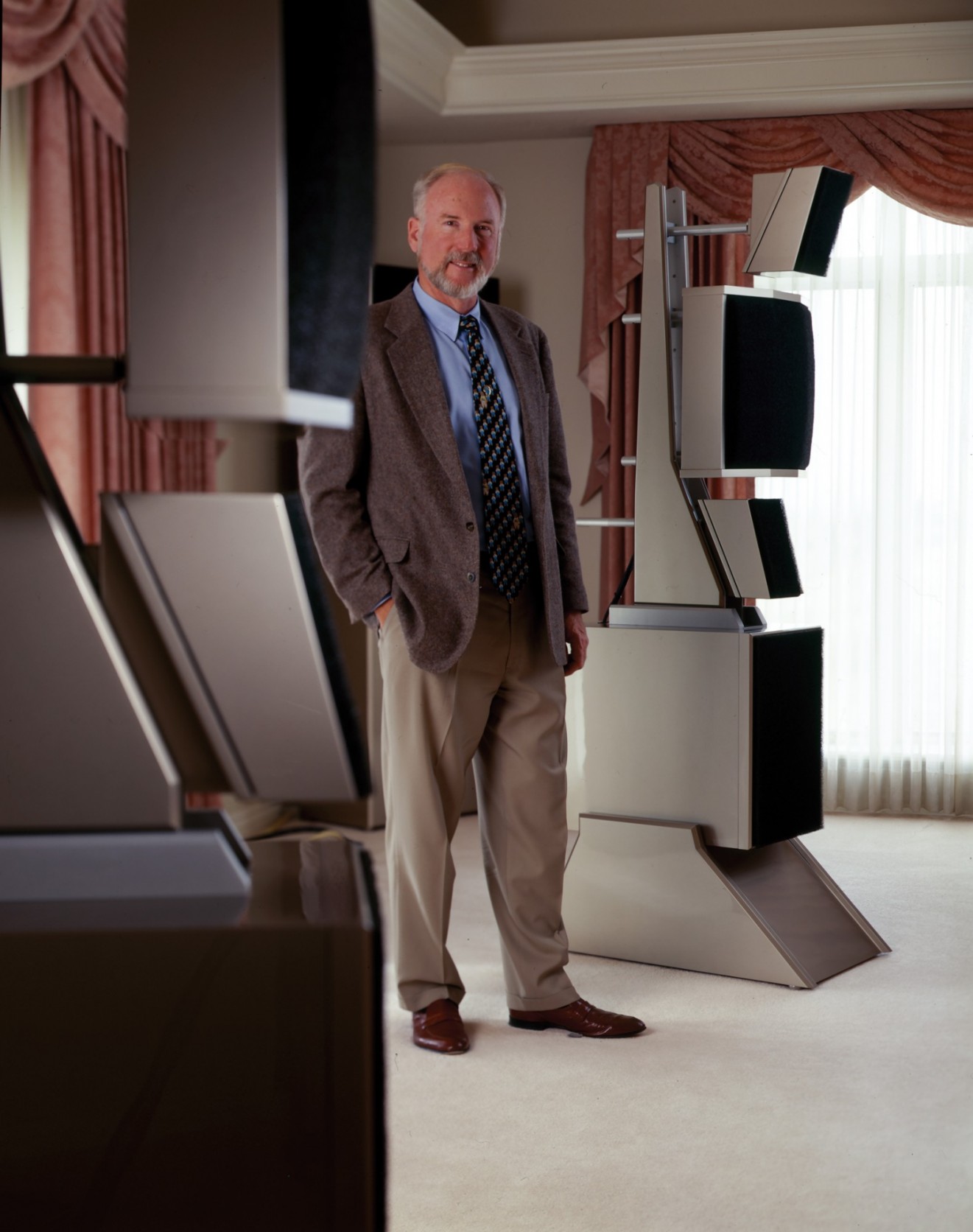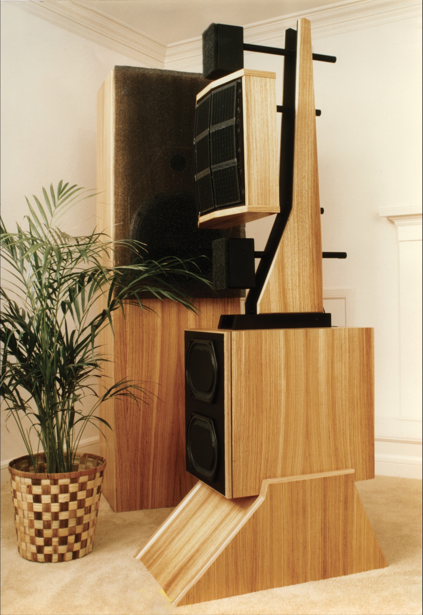 One WAMM channel consists of two 6½’ towers. One contains subwoofers which operate below 55Hz. The other is a set of full-range arrays. The lower portion is the midbass module. Above this, is a machined unit consisting of two midrange modules, one placed below and one above an electrostatic high-frequency module. The system also includes an electronic crossover and an equalizer.