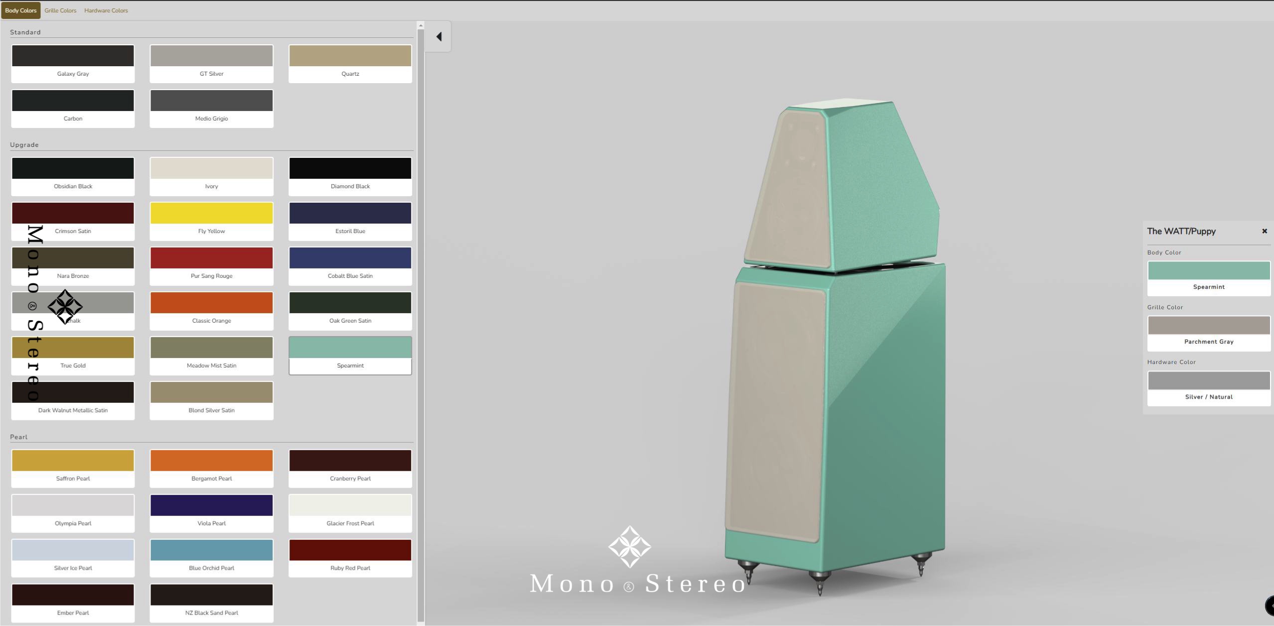 Wilson Audio: WilsonGloss Colors: Design The WATT/Puppy with our Wilson Audio Loudspeaker Configurator with remarkable accuracy. When combining our WilsonGloss colors, grilles, and hardware options, hundreds of combinations are available, allowing you to design a Wilson Audio speaker unique to your taste and décor. Click the link below to see available colors and combinations using our configurator.”