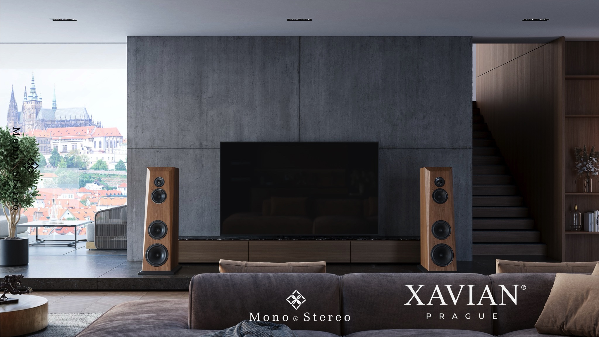 The Integrale model combines cutting-edge technology, natural materials, and flawless craftsmanship, blending seamlessly into the interior as the music itself. The installation is further enhanced by the equally exclusive Riviera Labs monoblocks, discreetly positioned so as not to disturb the luxurious purity of the space. Together with the magnificent view of Prague Castle, this creates an environment where design and emotion meet in perfect harmony.